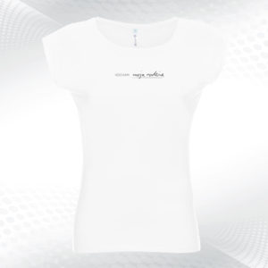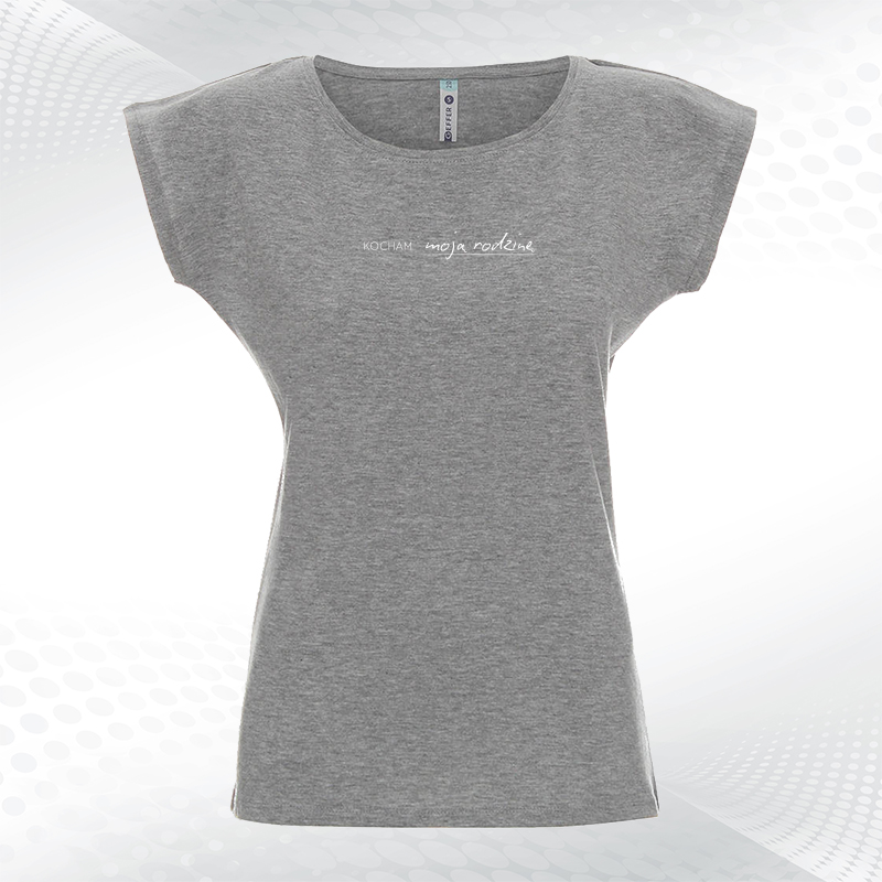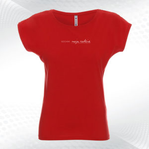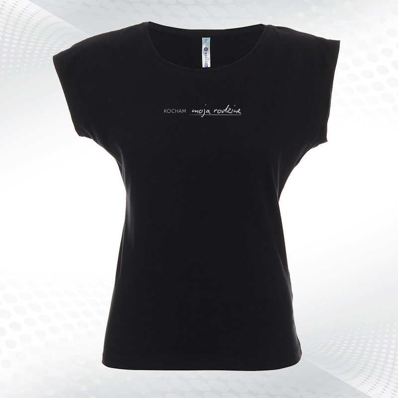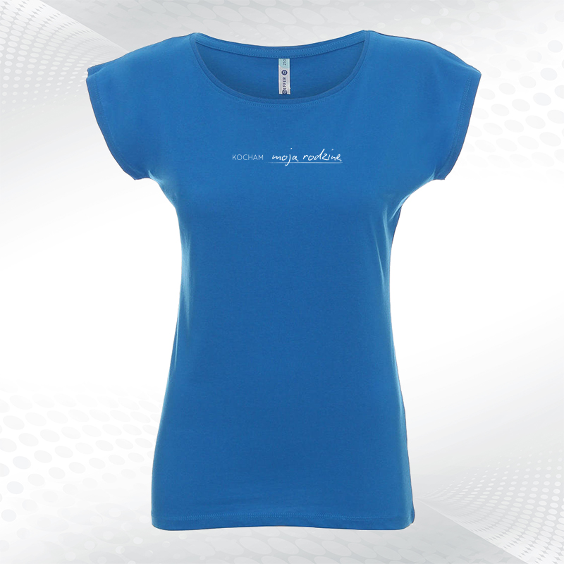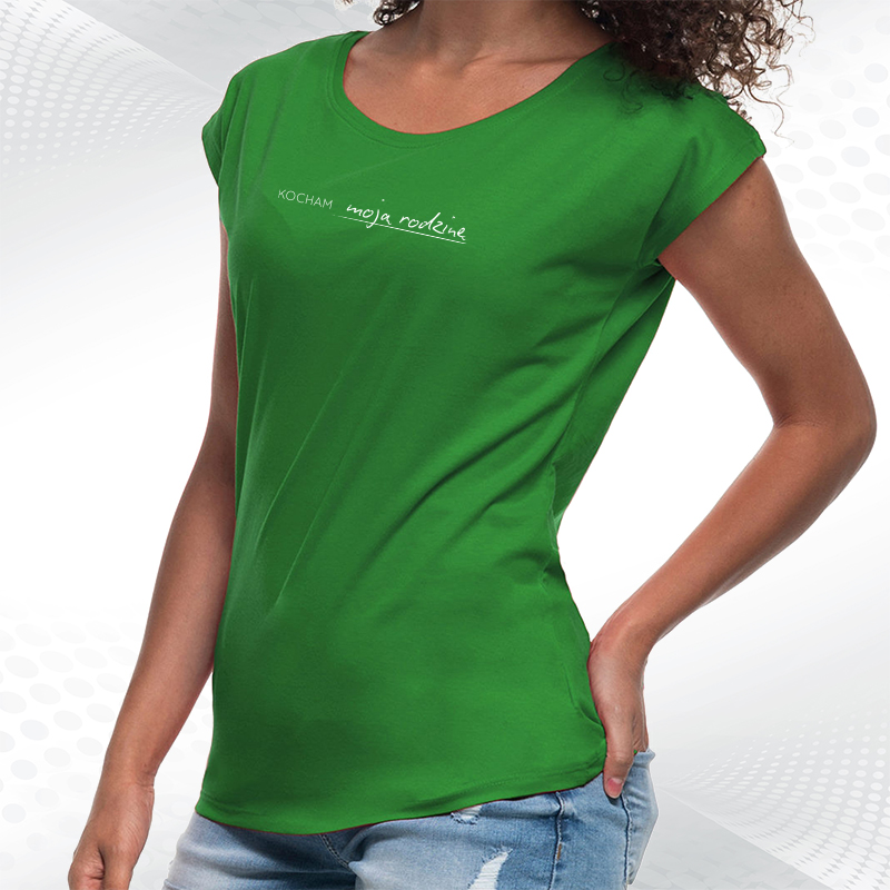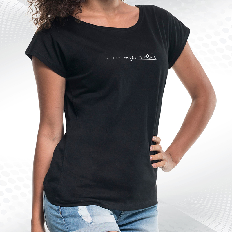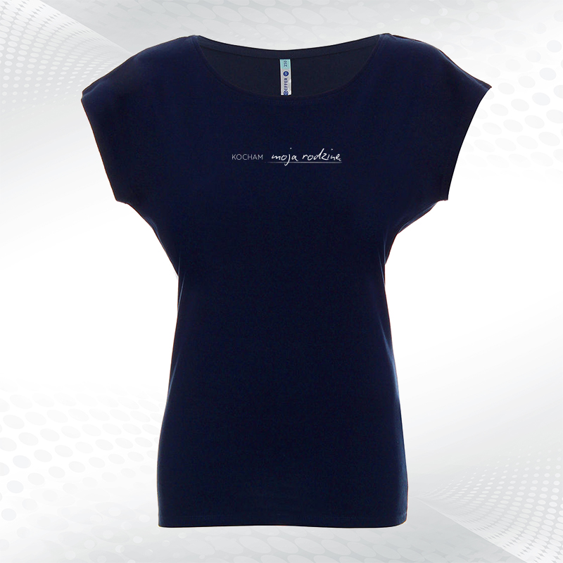 granatowa koszulka damska z dekoltem z chrześcijańskim napisemKocham Moją Rodzinę